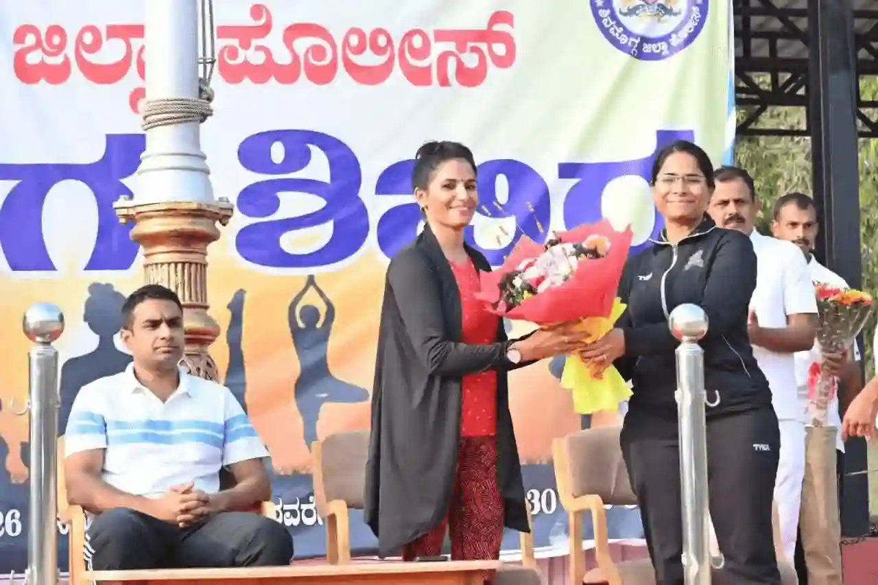 ಕಳೆದ ಮೂರು ದಿನಗಳಿಂದ ದಿನಾಂಕಃ 05-01-2026 ರಿಂದ 07-01-2026ರ ವರೆಗೆ ಶಿವಮೊಗ್ಗ ಜಿಲ್ಲಾ ಪೊಲೀಸ್ ವತಿಯಿಂದ ಆಯೋಜಿಸಲಾಗಿದ್ದ ಯೋಗ ತರಬೇತಿ ಶಿಬಿರದ ಸಮಾರೋಪ ಸಮಾರಂಭವನ್ನು ಈ ದಿನ ಡಿಎಆರ್ ಪರೇಡ್ ಮೈದಾನದಲ್ಲಿ ಹಮ್ಮಿಕೊಂಡಿದ್ದು, ಪೊಲೀಸ್ ಅಧಿಕಾರಿ ಹಾಗೂ ಸಿಬ್ಬಂದಿಗಳಿಗೆ ಯೋಗ ತರಬೇತಿ ನೀಡಿದ ಡಾ. ಭಾಗೀರತಿ ಕನ್ನಡತಿ ಯೋಗ ಗುರು ಇವರಿಗೆ ಜಿಲ್ಲಾ ಪೊಲೀಸ್ ವತಿಯಿಂದ ಸನ್ಮಾನಿಸಲಾಯಿತು. ನಂತರ ಯೋಗ ಕೈಪಿಡಿಯನ್ನು ಬಿಡುಗಡೆ ಮಾಡಲಾಯಿತು.